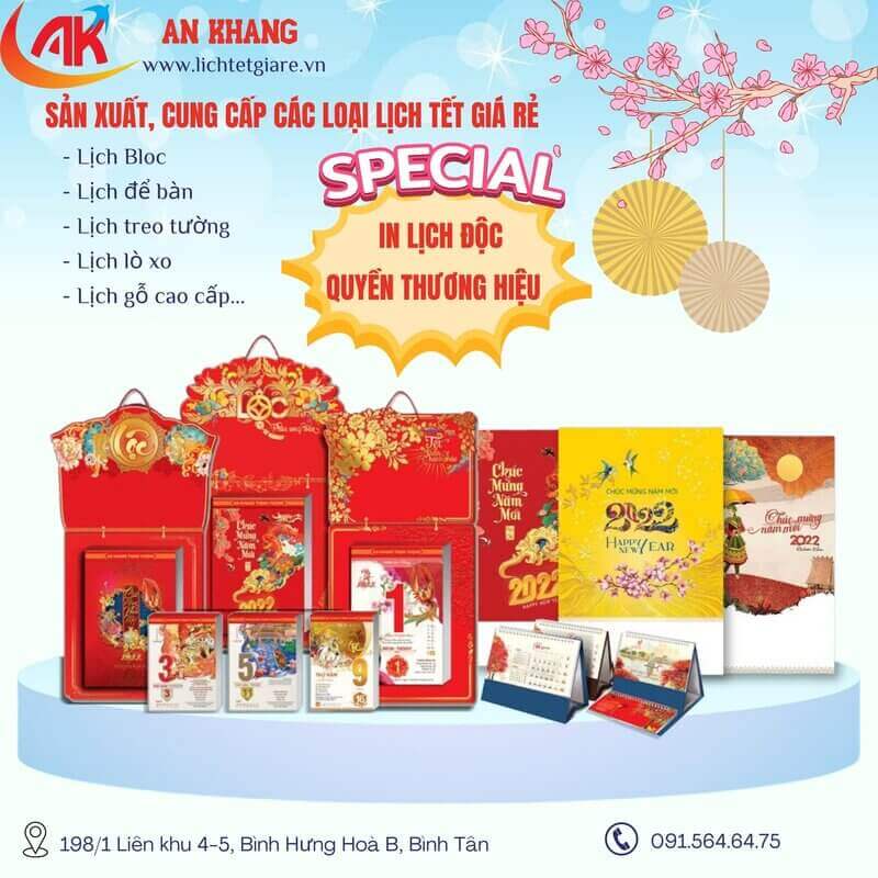 Mỗi năm một mùa cuối năm, các công ty lại rộn rã tìm kiếm quà tặng cho đối tác, khách hàng, quà tặng tết phải làm sao ấn tượng, thiết thực mà quan trọng nhất là phải phù hợp với ngân sách của công ty. Do đó, lịch tết luôn được đứng đầu trong danh sách quà tặng tết, với kinh phí vừa và nhỏ thì công ty có thể chọn lịch bàn hay lịch treo tường đơn giản, với kinh phí cao hơn, lịch cần cầu kỳ hiện đại hơn thì có thể chọn bộ bloc cao cấp. An Khang in lịch tết cho công ty, doanh nghiệp với mọi số lượng giá rẻ!